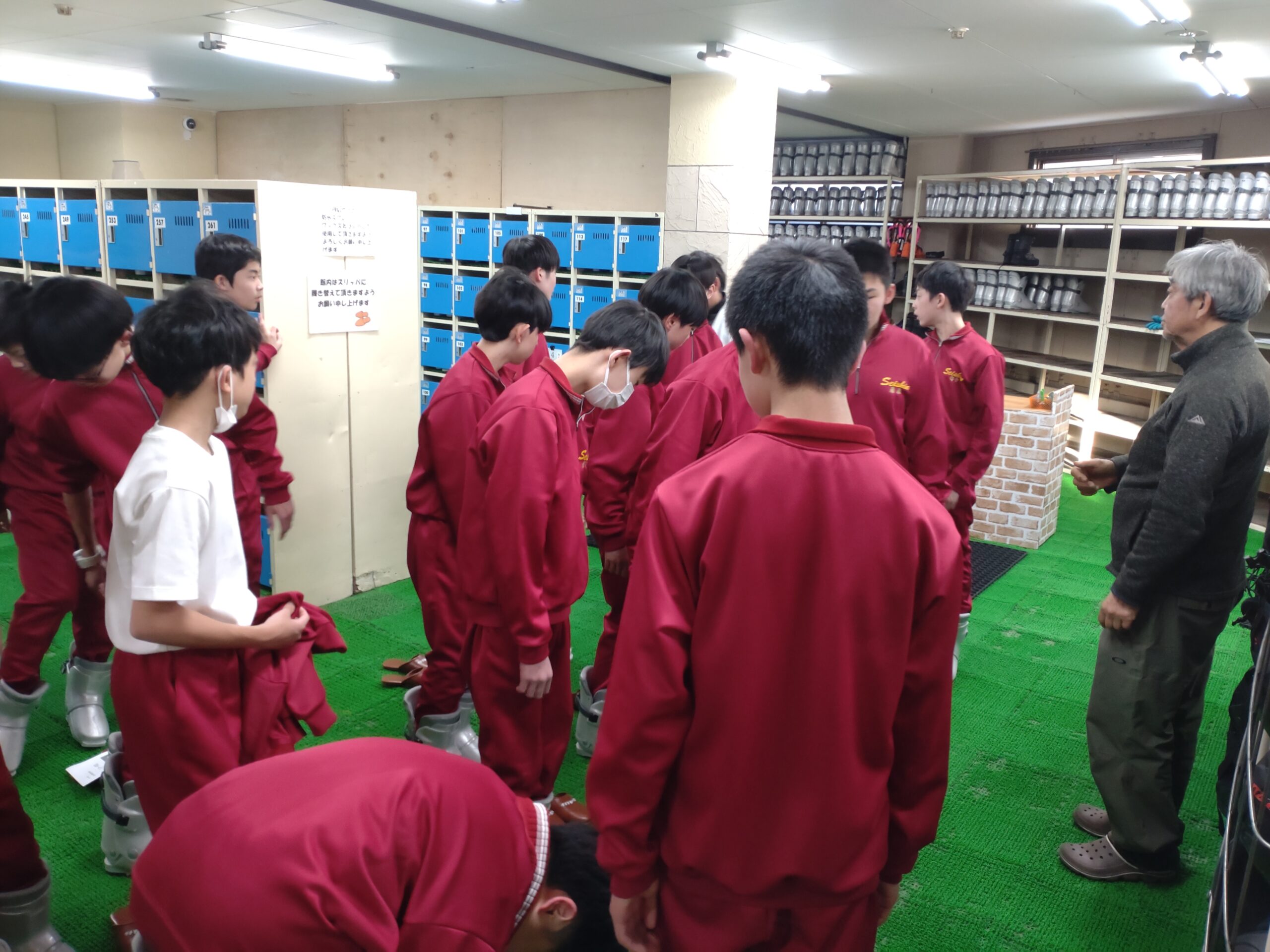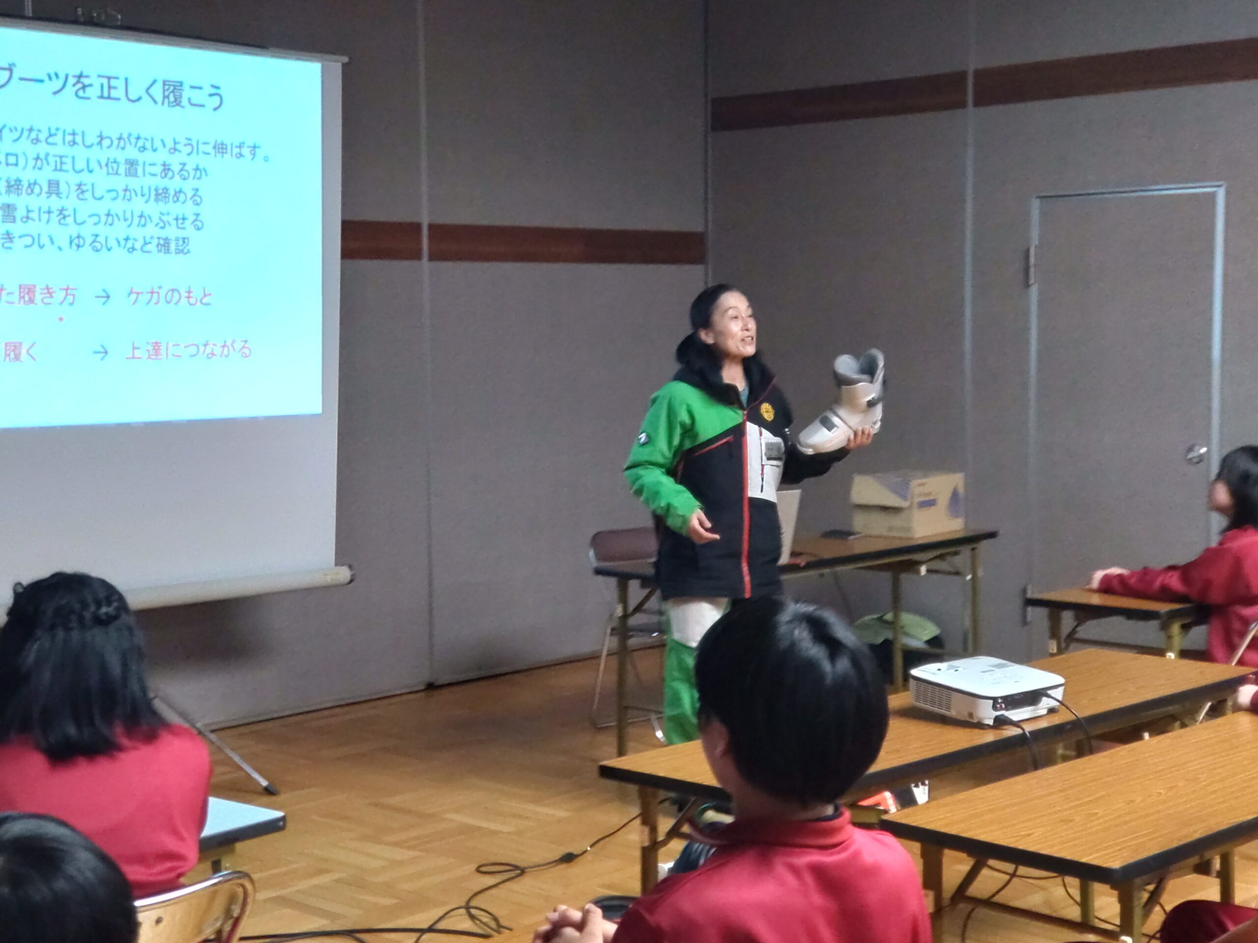夕食後、1年生はスキーの事前講習会を行い、スキー板の持ち方やブーツのはき方などを習いました。