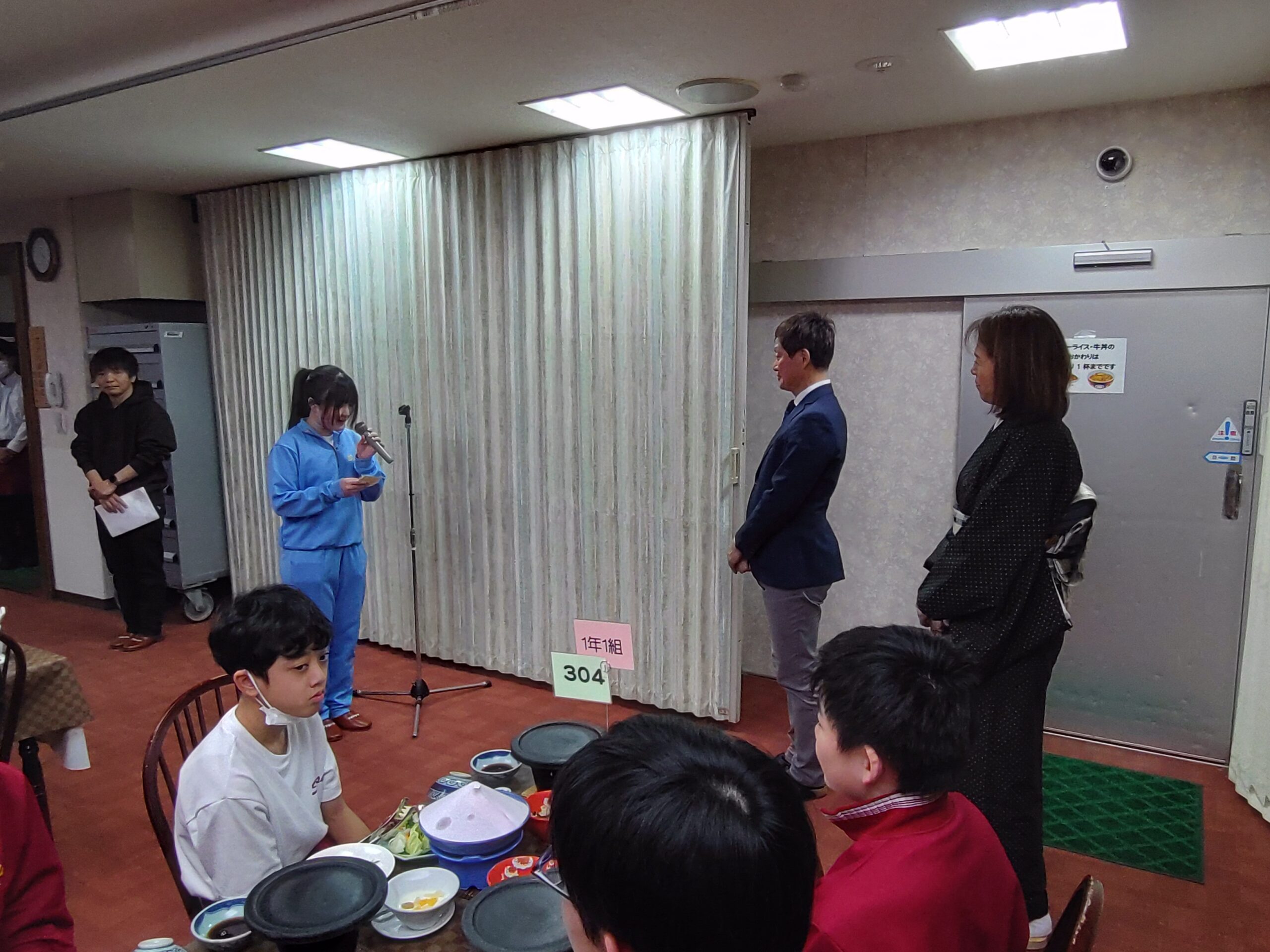 ホテル到着後はスキーウェアやブーツなどのサイズ合わせ、部屋超会議をした後、入所式で4日間お世話になるホテルの皆様に挨拶し、おいしい夕食をいただきました。