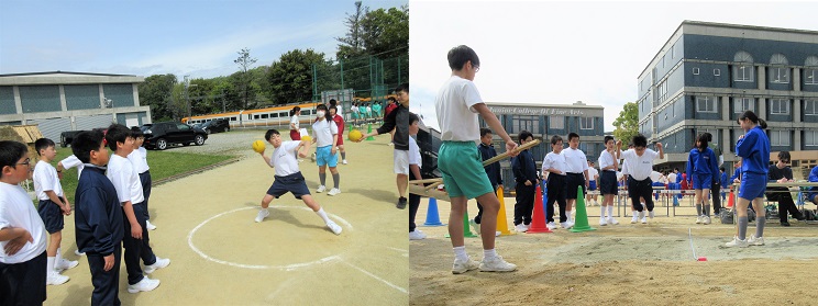 4月11日(水)に新体力テストと身体測定、視力・聴力検査を実施しました。薄曇りですが穏やかな気候のもと、2~6年生は励まし合いながら、昨年度の記録を更新しようと真剣に取り組んでいました。 一方、入学して一週間余りの一年生にとっては、初めての学校行事で少し緊張気味。それでも学年の先生方の引率のもと、先輩の様子を参考にしながら初めての測定に取り組み、さらに記録を伸ばしたいと来年への意気込みを見せていました。